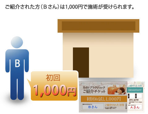 一緒に来院されますとその場で裏面に確認印を押させていただきますので、ご紹介された方(Bさん)は1,000円で、ご紹介した方(Aさん)は2回500円引きで施術を受けることができます。