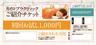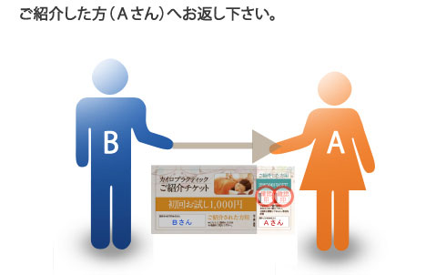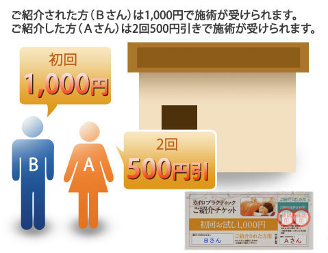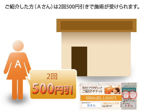 紹介した方(Aさん)は、お受け取りになった確認印のあるチケットで2回500円引きで施術を受けるをことができます。